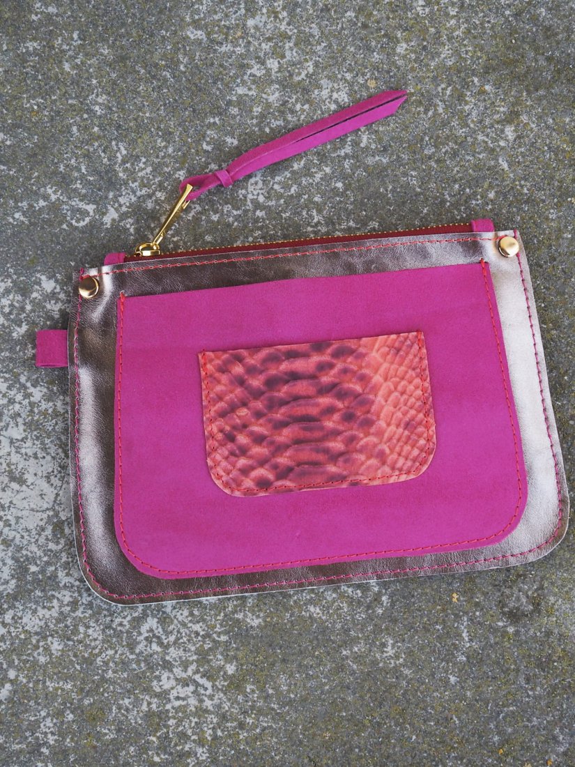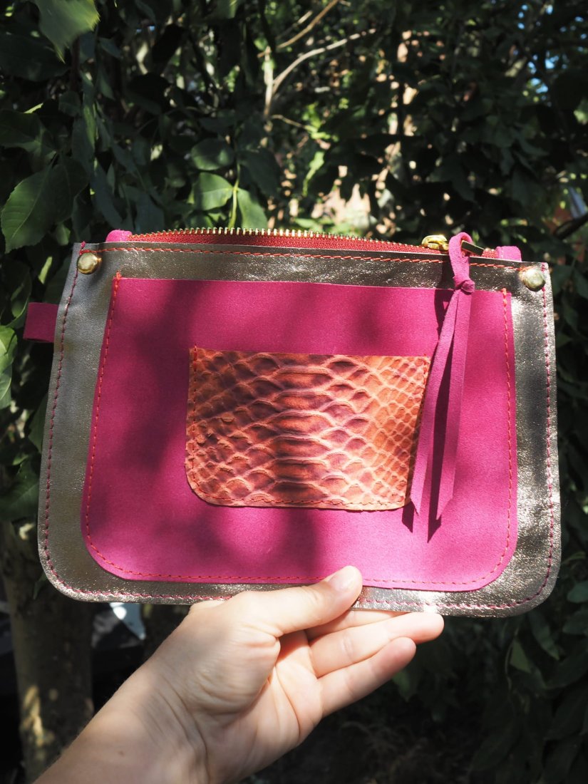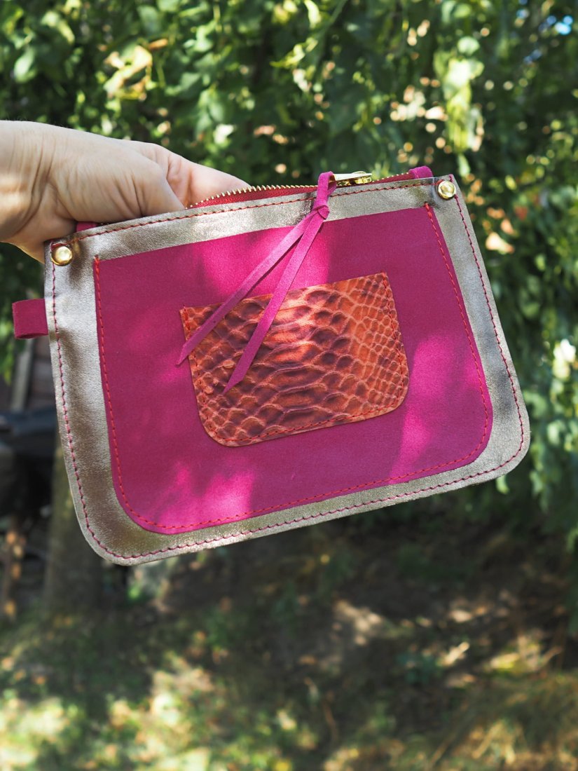 Saszetka Bella uszyta została z połączenia kolorowych skór: licowych, zamszowych oraz nubuku.