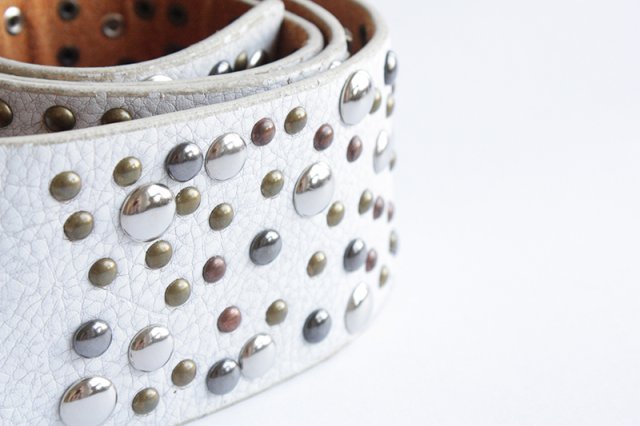 Szeroki pasek ze skóry naturalnej, ozdobionym ćwiekami w kolorze starego złota i srebra. Drobnym mankamentem był brak części zapięcia, jednak zostało to naprawione domowym sposobem (jak na zdjęciu). Myślę, że domowa złota rączka napewno zrobi to lepiej :-)