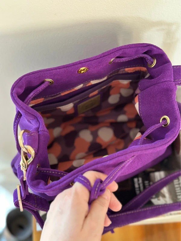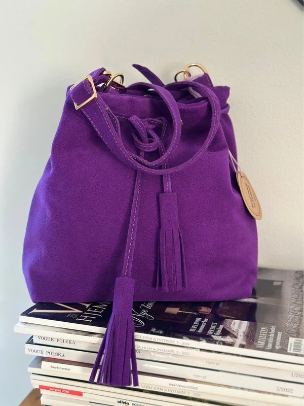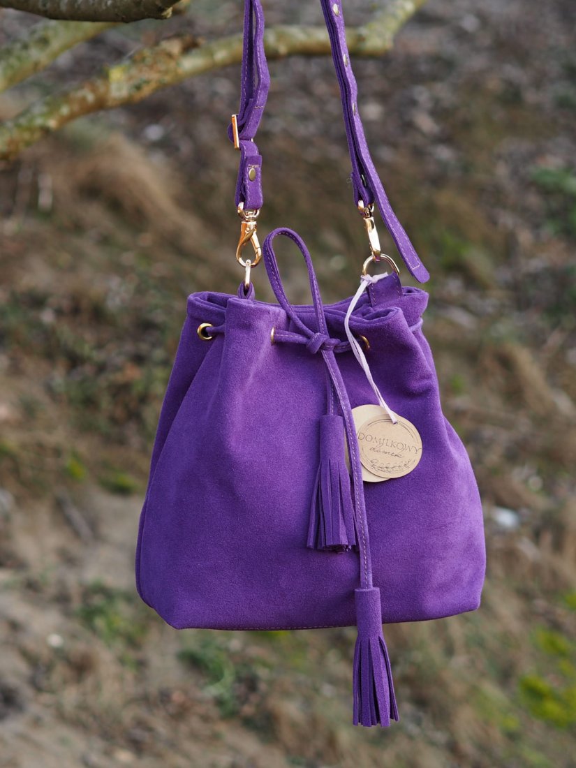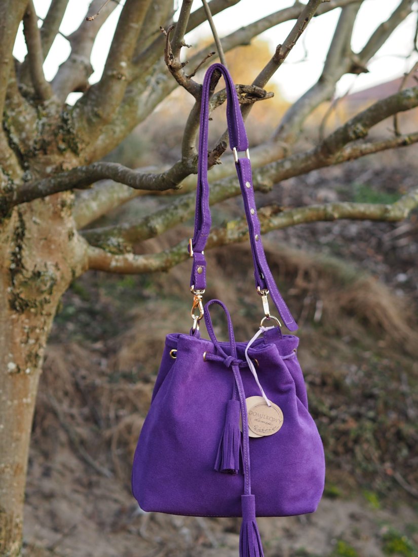 Uniwersalna i klasyczna torebka – mini worek wykonana w całości z wysokiej jakości skóry zamszowej pozyskanej z polskiej garbarni.