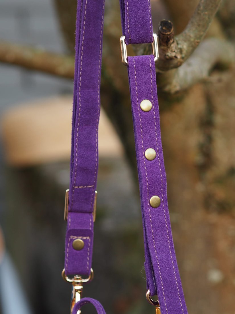 Skórzana torebka damska - woreczek z regulowanym paskiem w kolorze fioletowym.