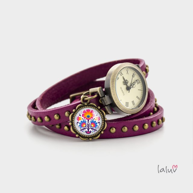 Stylowy zegarek na skórzanym pasku w kolorze różowym, trzykrotnie zakręcanym na nadgarstku z ręcznie robioną zawieszką z wysokiej jakości grafiką zamkniętą pod wypukłym szkiełkiem i oprawioną w antyalergiczną bazę w kolorze starego złota.