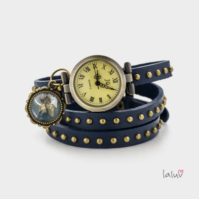 Stylowy zegarek na skórzanym pasku w kolorze granatowym, trzykrotnie zakręcanym na nadgarstku z ręcznie robioną zawieszką z wysokiej jakości grafiką zamkniętą pod wypukłym szkiełkiem i oprawioną w antyalergiczną bazę w kolorze starego złota.