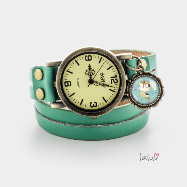 Stylowy zegarek na skórzanym pasku w kolorze zielonym, dwukrotnie zakręcanym na nadgarstku z ręcznie robioną zawieszką z wysokiej jakości grafiką zamkniętą pod wypukłym szkiełkiem i oprawioną w antyalergiczną bazę w kolorze starego złota.