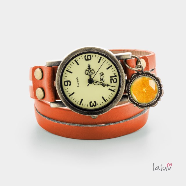 Stylowy zegarek na skórzanym pasku w kolorze pomarańczowym, dwukrotnie zakręcanym na nadgarstku z ręcznie robioną zawieszką z wysokiej jakości grafiką zamkniętą pod wypukłym szkiełkiem i oprawioną w antyalergiczną bazę w kolorze starego złota.