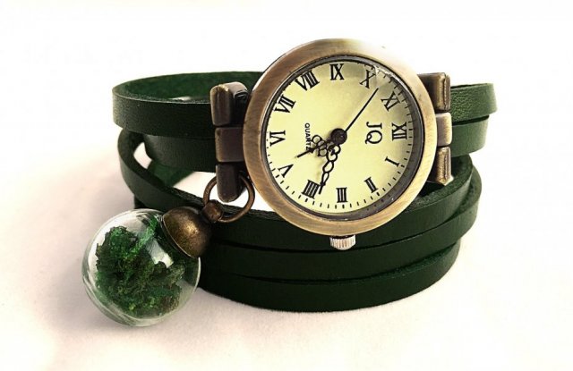 Bardzo dobrej jakości zegarek ze skórzanym paskiem, kilkukrotnie zakręcanym na ręku z ręcznie robioną zawieszką z prawdziwym mchem.