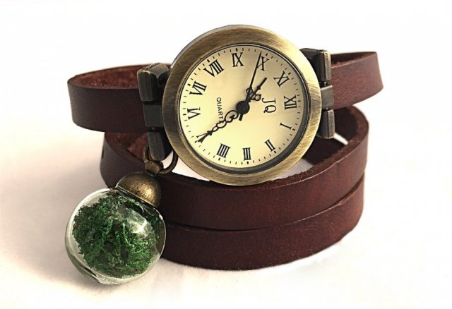 Bardzo dobrej jakości zegarek ze skórzanym paskiem, kilkukrotnie zakręcanym na ręku z ręcznie robioną zawieszką z prawdziwym mchem.