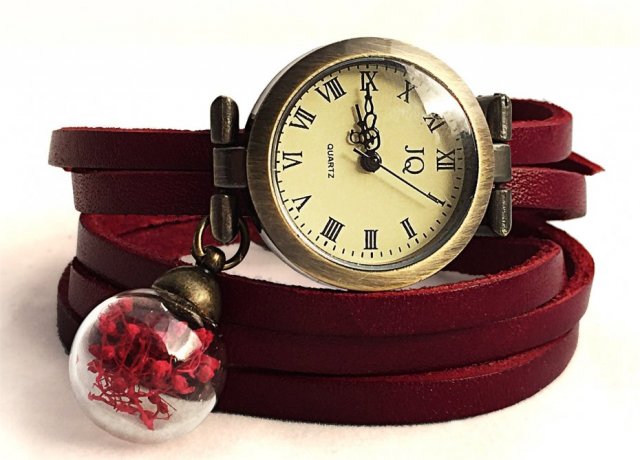 Bardzo dobrej jakości zegarek ze skórzanym paskiem, kilkukrotnie zakręcanym na ręku z ręcznie robioną zawieszką z suszonymi kwiatami.