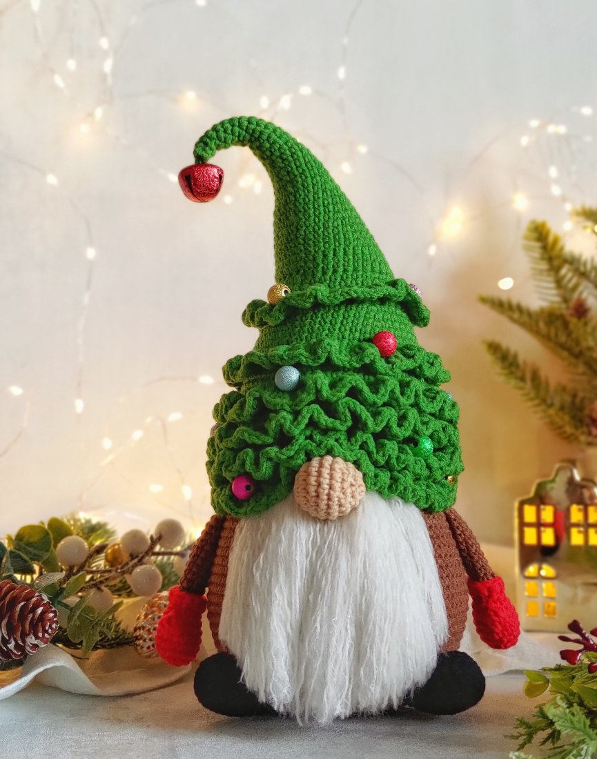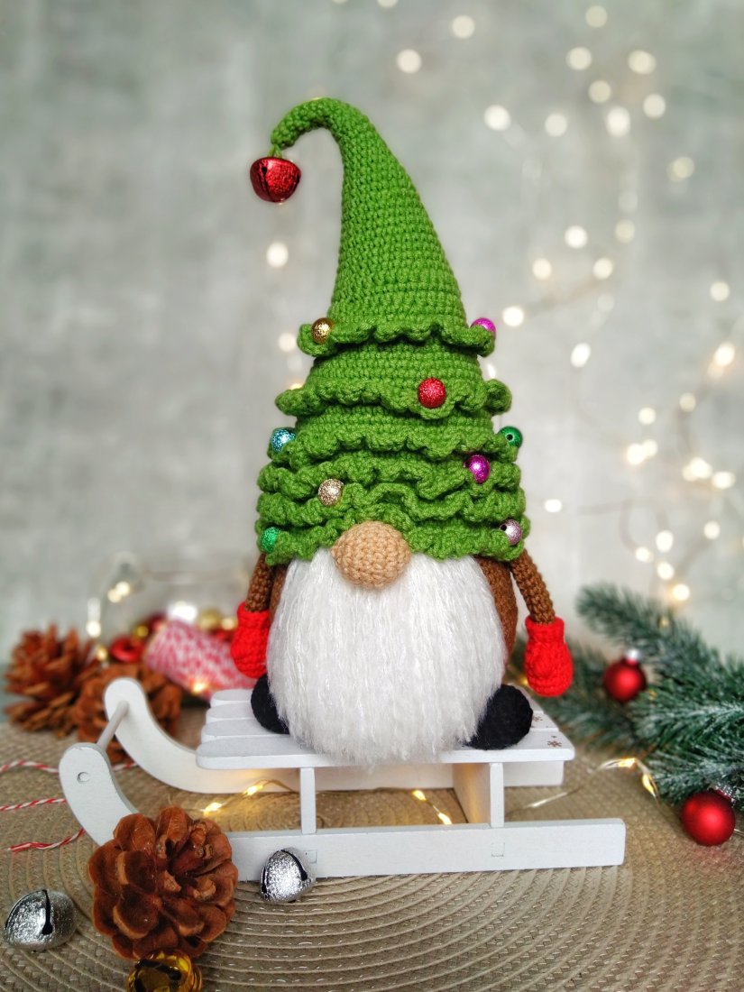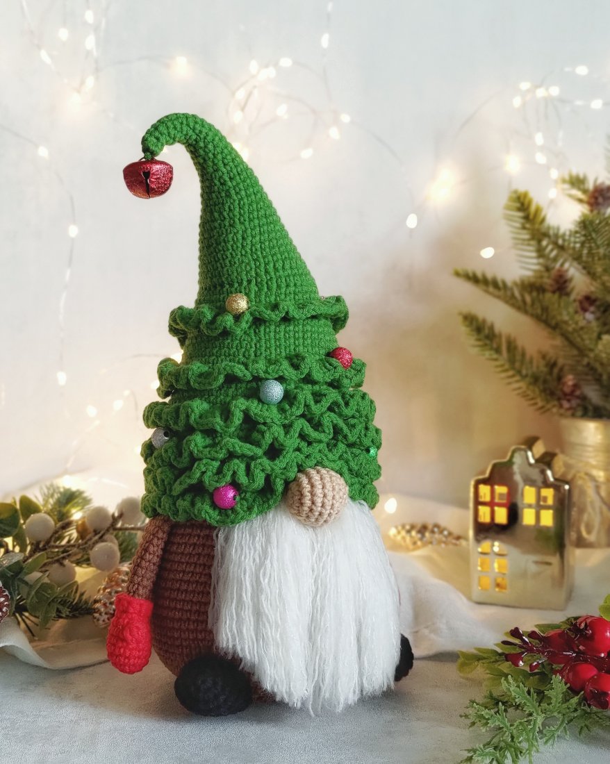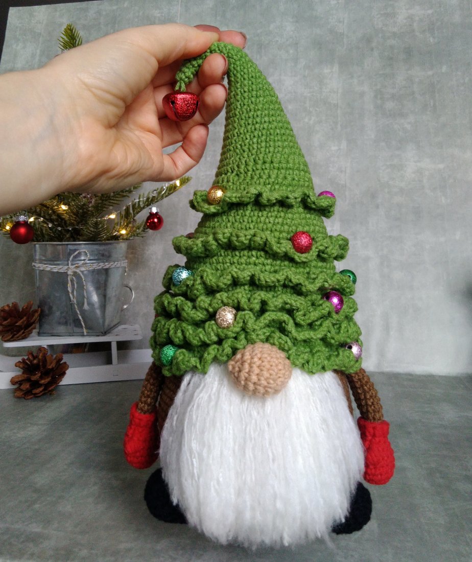 - Czapka gnoma ma kształt choinki, ozdobiona jest kolorowymi, błyszczącymi koralikami, a na końcu kapelusza wisi metalowy dzwoneczek (kolor losowy).