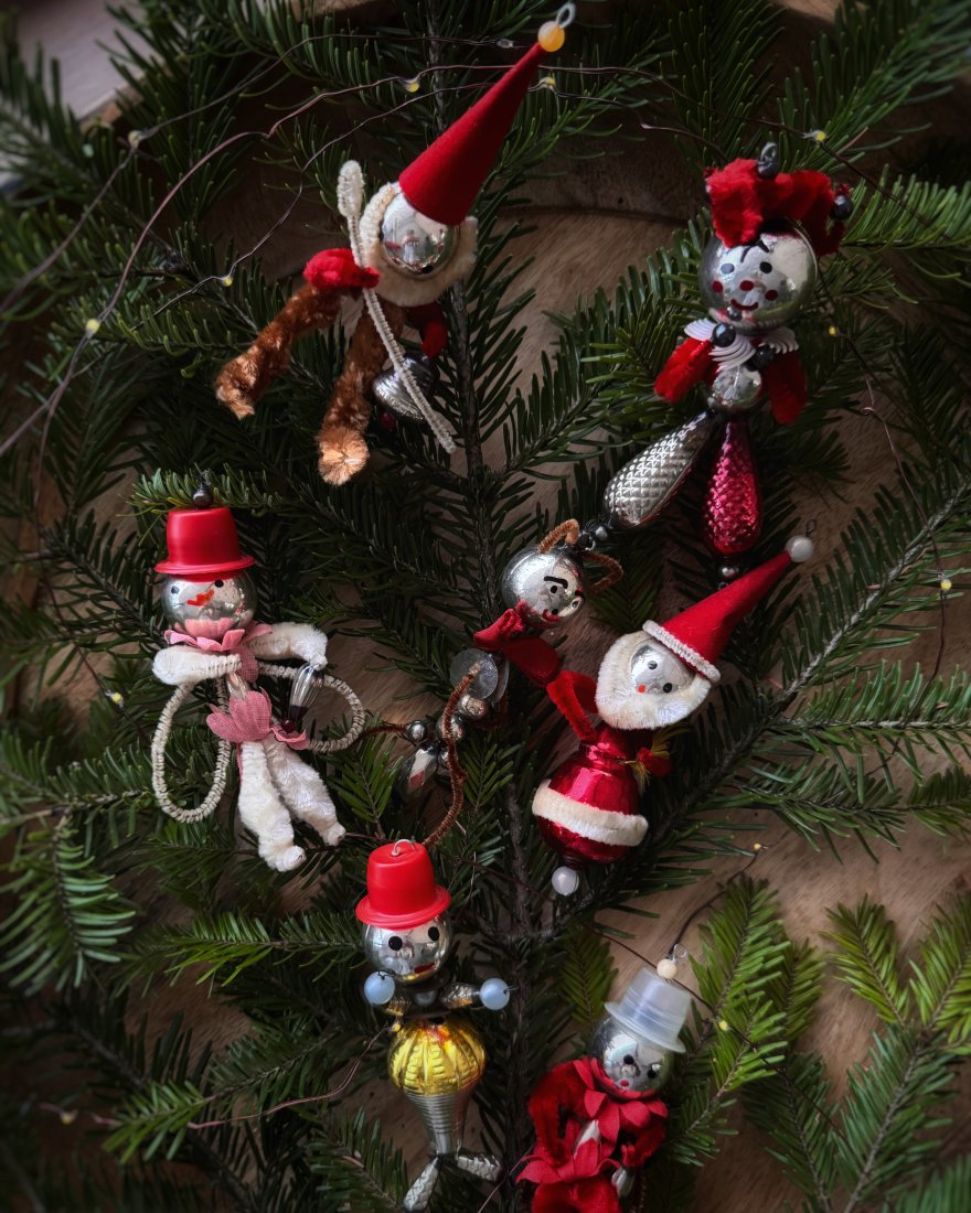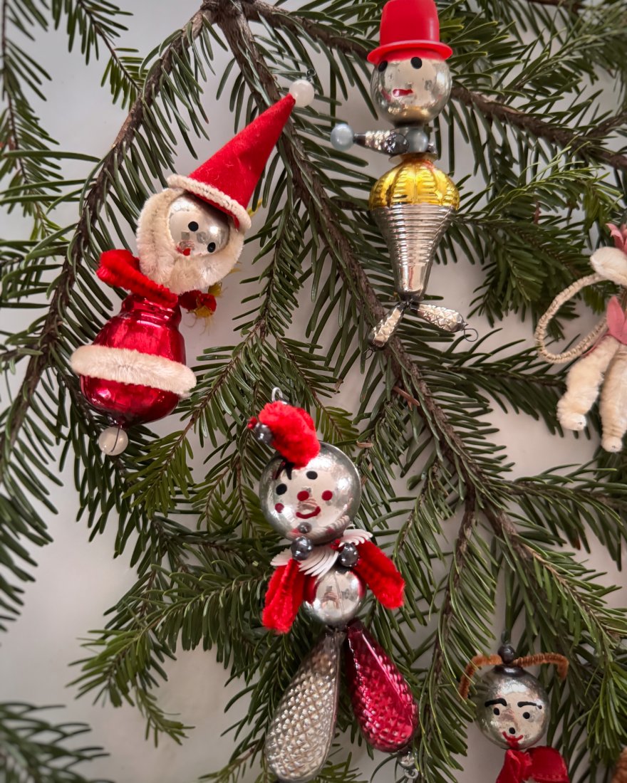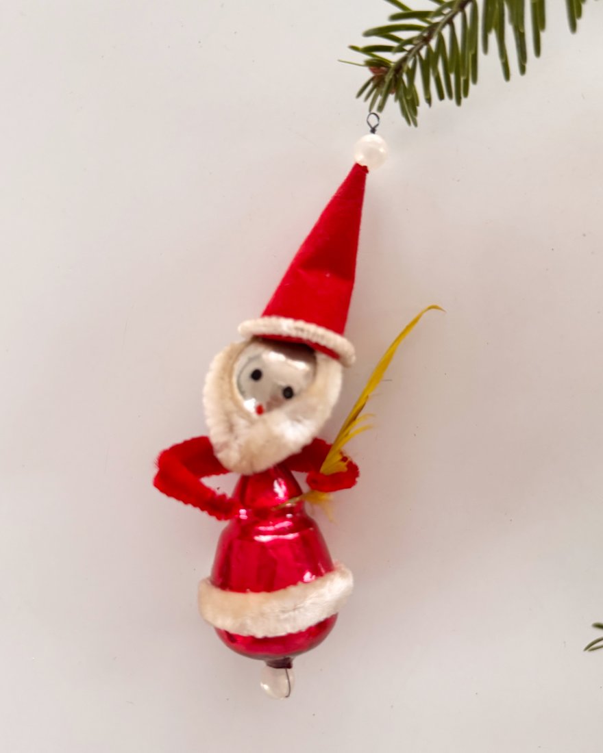Ozdoba choinkowa w kształcie ludzika wykonana ręcznie na bazie bombek, drucików ozdobnych i innych detali oraz ręcznie malowana.