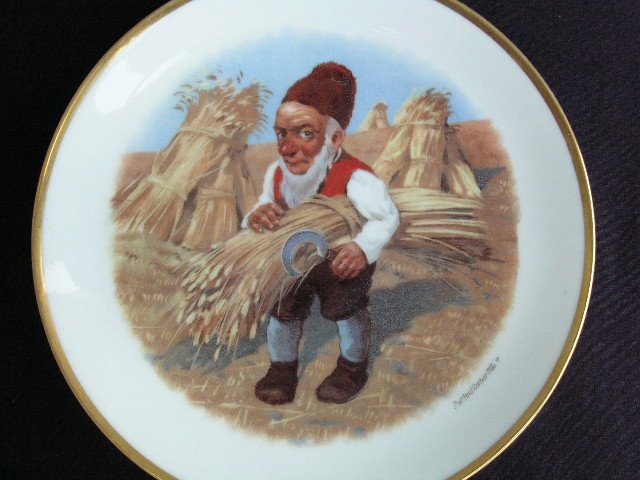Porcelanowy talerz, sygnowany Thomas (Rosenthal) Bavaria. Z serii skrzato-krasnoludków na każdy miesiąc roku, autorstwa Prof. Paula Lothara Mullera. Rant złocony, wysoka jakość malatury, błyszczące szkliwienie. 21,5 x 2 cm. Z tyłu zawieszka do powieszenia.