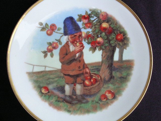 Porcelanowy talerz, sygnowany Thomas (Rosenthal) Bavaria. Z serii skrzato-krasnoludków na każdy miesiąc roku, autorstwa Prof. Paula Lothara Mullera. Rant złocony, wysoka jakość malatury, błyszczące szkliwienie. 21,5 x 2 cm. Z tyłu zawieszka do powieszenia.