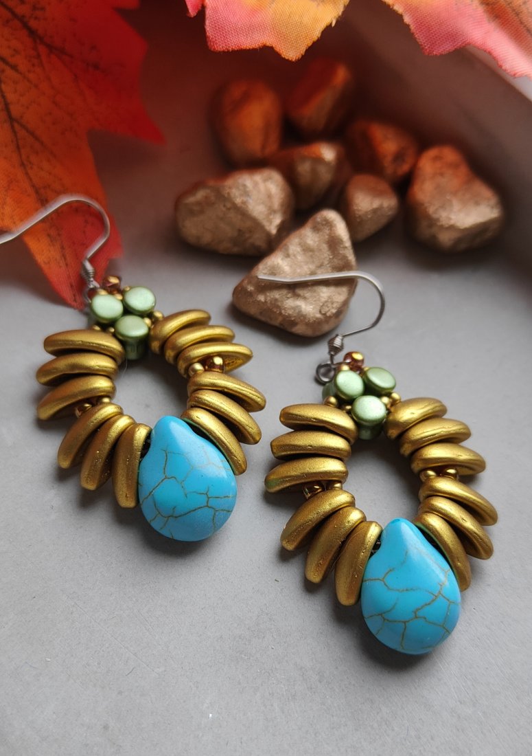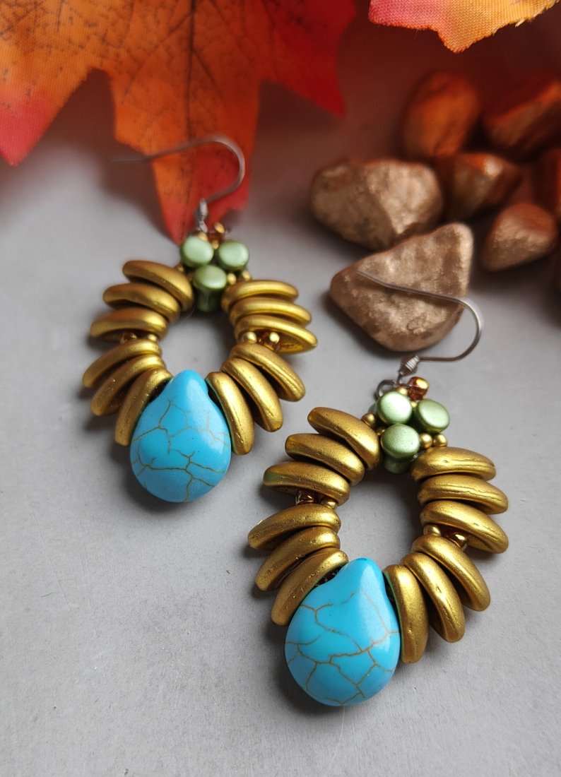 ,, skrzydełka w złocie,, to utrzymane w rustykalnym stylu kolczyki wykonane z koralików w kolorze złota z dodatkiem turkusowej kropli. Kolczyki zawieszone są na klasycznych biglach wykonanych ze stali szlachetnej.