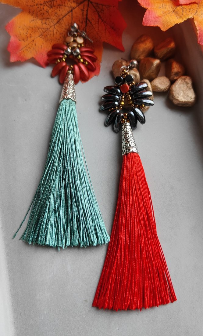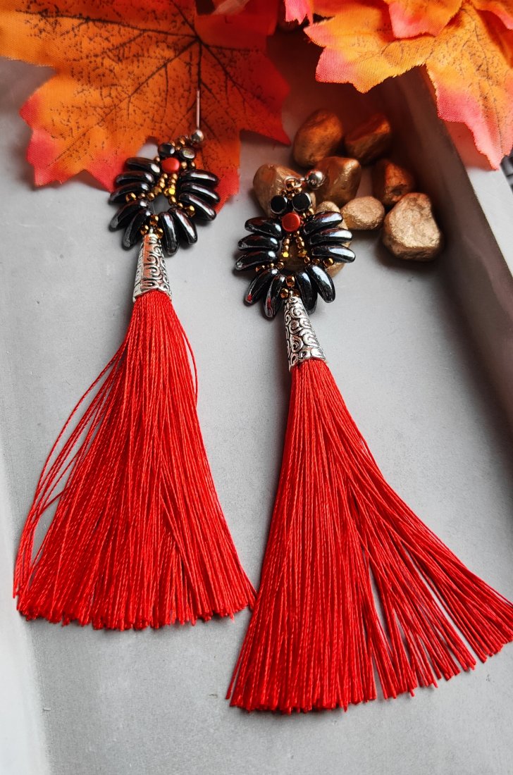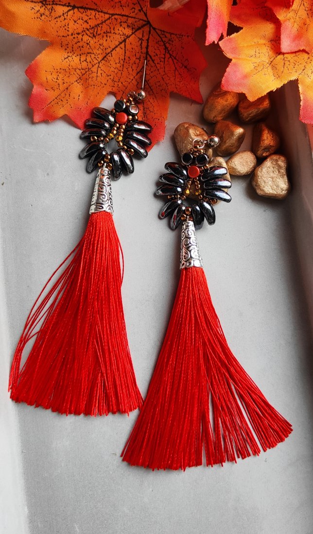 ,, skrzydełka z czerwonym chwostem,, to długie wiszące kolczyki wykonane z chwosta w kolorze czerwonym i szklanych koralików w kolorze czarnym, złotym i czerwonym. Kolczyki zawieszone są na ozdobnych biglach typu sztyft wykonanych ze stali szlachetnej.