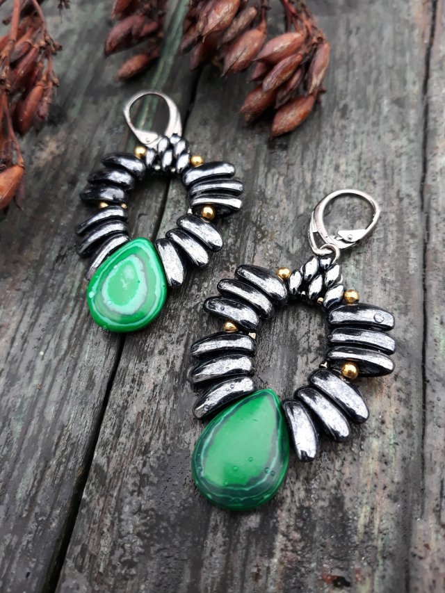 ,,skrzydełka z malachitem,, to utrzymane w kolorystyce czerni i zieleni kolczyki wykonane z malachitu, złotego hematytu i szklanych koralików. Kolczyki zawieszone są na ozdobnych oksydowanych biglach typu angielskiego.