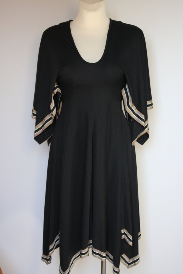 wyjątkowa sukienka vintage z lat 70-tych z niesamowicie szerokimi rękawami z dużym rozcięciem, wykończona pasiastą lamówką, głęboki dekolt, na plecach zapięcie na suwak i haftkę, dół asymetryczny, wycięta metka ze składem i rozmiarem
