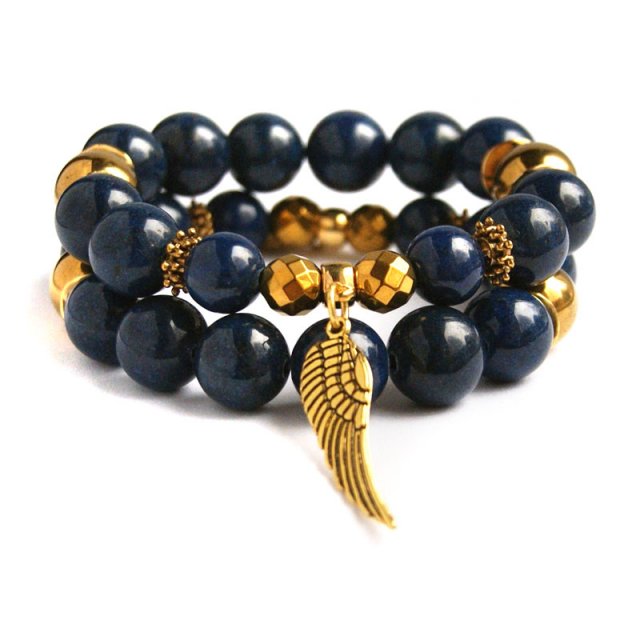 POMYSŁ NA PREZENT ;-) piękna, zjawiskowa bransoletka na solidnej lince elastycznej, wykonana ze starannie dobranych kamieni, tworzących wyjątkową kompozycję: sporye kule granatowego marmuru (12mm) , dodatkowo: po 2 kule marmuru 10mm, złotego hematytu 12mm, złotego hematytu fasetowanego 9mm... do tego mnóstwo metalowych elementów w kolorze złota - ozdobne pierścienie i urocza zawieszka : skrzydełko :) obw. WEWNĘTRZNY : 15,6cm.... UWAGA!!! CENA DOT. 1 BRANSOLETKI (zdj.2) .... ZOBACZ CAŁĄ KOLEKCJĘ! .... POLECAM podobne do kompletu ;-) ... moja biżu zawsze podróżuje w ozdobnym opakowaniu handmade :D