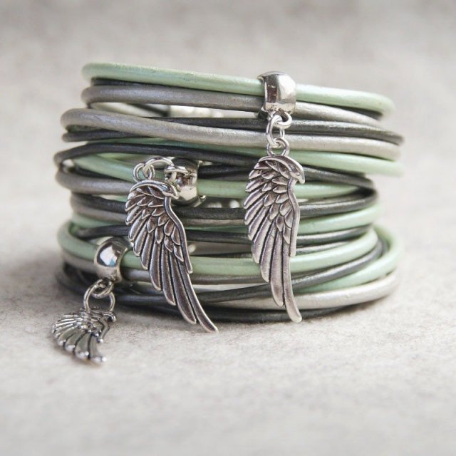POMYSŁ NA PREZENT ;-) delikatna bransoletka wykonana z 4 rzemieni ze 100% skórki naturalnej w odcieniach metalicznych/perłowych (po 2 rzemienie 3mm i 2mm); duża zawieszka (SKRZYDŁO ANIOŁA) i wykończenie w kolorze srebra. długość regulowana za pomocą łańcuszka. BRANSOLETKA PASUJE NA NADGARSTEK OD 14,5CM. możesz ją nosić samodzielnie lub dowolnie łączyć z innymi bransoletkami z tej serii. świetnie prezentuje się też w zestawieniu z bransoletkami z kamieni naturalnych. UWAGA! CENA DOTYCZY 1 BRANSOLETKI (1 skrzydełko) w kolorystyce ze zdjęcia 1. ... spójrz jak podobna bransoletka prezentuje się na nadgarstku ... ZOBACZ CAŁĄ KOLEKCJĘ!!! ... MOJA BIŻU ZAWSZE PODRÓŻUJE OZDOBNIE ZAPAKOWANA - opakowanie hand made ;-) .