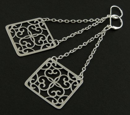 Kolczyki wykonane z materiałów posrebrzanych o długości 9 cm, bigle zapinane. Bardzo lekkie:)