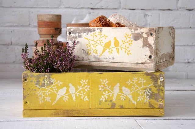 Skrzyneczki wykonane i malowane ręcznie z ozdobnym szablonem. Świetnie nadadzą się nie tylko do przechowywania drobiazgów ale przede wszystkim stanowić będą piękna dekoracje. Można zawiesić je na ścianie jako polki. Możliwość wykonania skrzynki na zamówienie według własnego pomysłu.