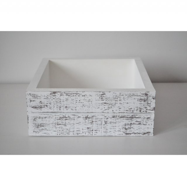 Drewniana krzynka została wykonana ręcznie, pomalowana na biało beżowo (przecierana). Wymiary zewnętrzne: 28 cm x 28 cm, wys.10,5 cm.
