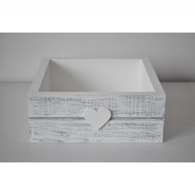 Drewniana krzynka została wykonana ręcznie, pomalowana na biało szaro (przecierana). Ozdobiona jest białym serduszkiem. Wymiary zewnętrzne: 28 cm x 28 cm, wys.10,5 cm.