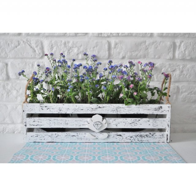 Drewniana krzynka została wykonana ręcznie, pomalowana na biało brązowo (przecierana). Ozdobiona jest dekorem wyciętym z drewnianej sklejki. Uchwyty wykonane są z zaplecionego sznurka. Wymiary zewnętrzne: długość 41,5 cm, szer. 13 cm, wys. 10 cm.