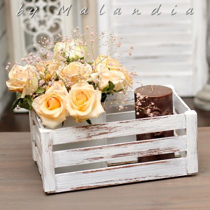 Drewniana skrzynka, malowana ręcznie metoda shabby chic, widoczne przetarcia nadają jej niepowtarzalny charakter. Sprawdza się jako dekoracja na półce, stole, nadaje się np. na skrzynkę, w której podamy owoce.