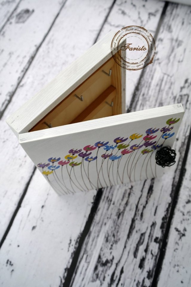 Ręcznie malowane farbami akrylowymi (ekologicznymi), odpornymi na wodę drewniane pudełko na klucze. Pudełko wiszące, otwierane, posiada w środku 6 wieszaczków na klucze, albo inne drobiazgi.