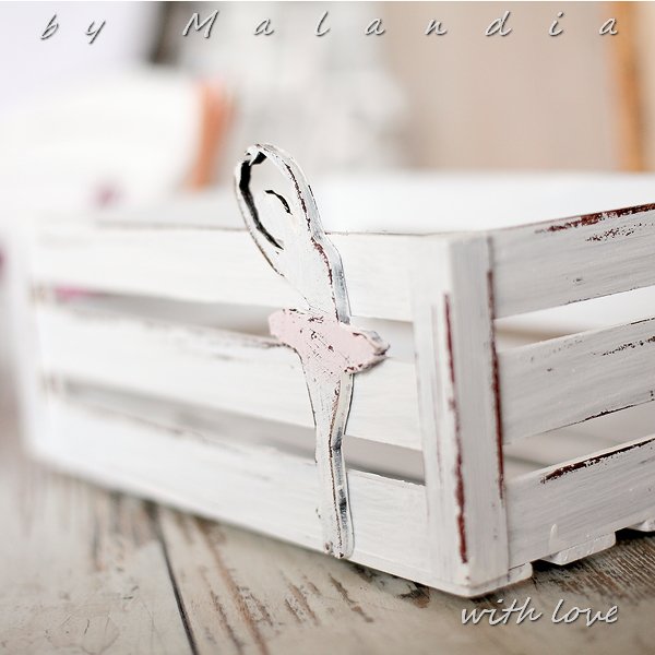Drewniana skrzynka z listew, malowana ręcznie metoda shabby chic, widoczne przetarcia nadają jej niepowtarzalny charakter,dodana do białego baletnica wirująca w tańcu spodoba się wielbicielka tańca. Sprawdza się jako dekoracja na półce, stole, nadaje się też na skrzynkę, w której schowamy ulubione rzeczy.