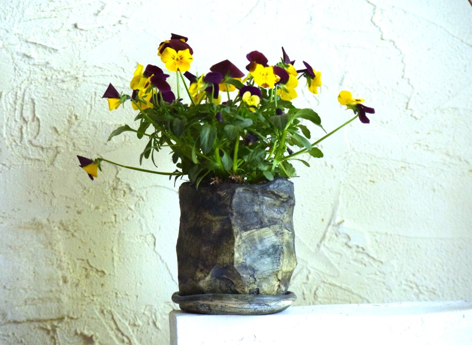 Ta doniczka jest jak fragment morskiej skały. Jej nieregularna, rzeźbiarska forma i surowe wykończenie sprawiają, że jest jedyna w swoim rodzaju. Ostro ciosana, z każdej strony jest trochę inna w swoim kształcie i załamującym się na jej ściankach kolorze. Przez to wystarczy ją lekko obrócić, a już ma się wrażenie, że to inna doniczka na kwiatka. Dla dodatkowego efektu nachyliłam ją specjalnie, ale bez obaw, jest całkowicie stabilna!