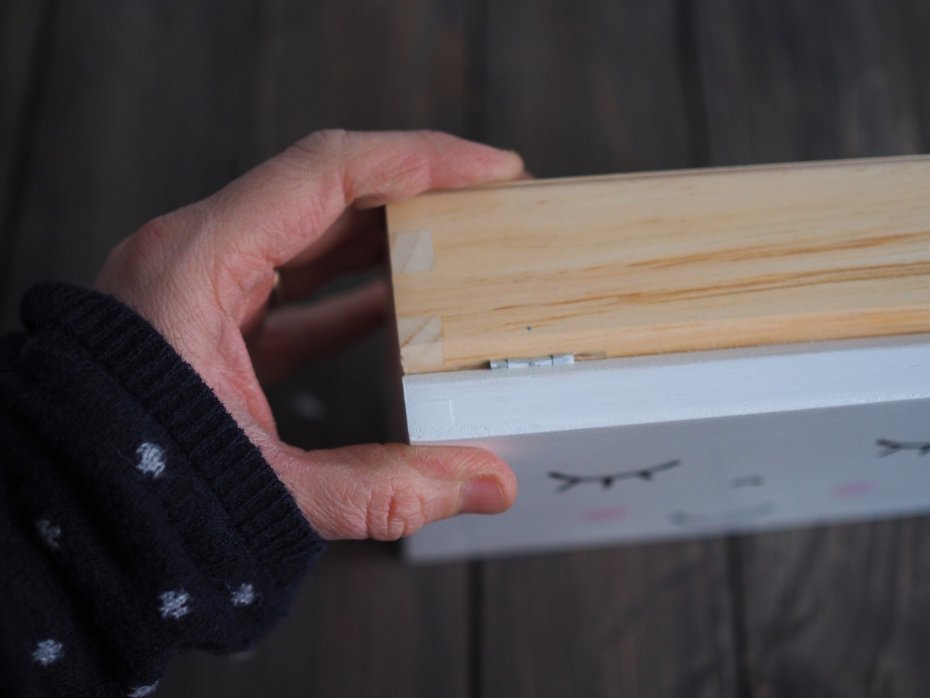Pudełko wykonane z drewna, pomalowane farbami akrylowymi, o wymiarach wewnętrznych 11 x 16 cm i wys. 5,3 cm.