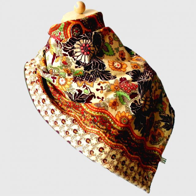 Kolorowy, folkowy komin, szal, chusta, uszyty z mięsistego , miłego dla skóry włoskiego dżerseju i wzorzystej tkaniny bawełnianej.