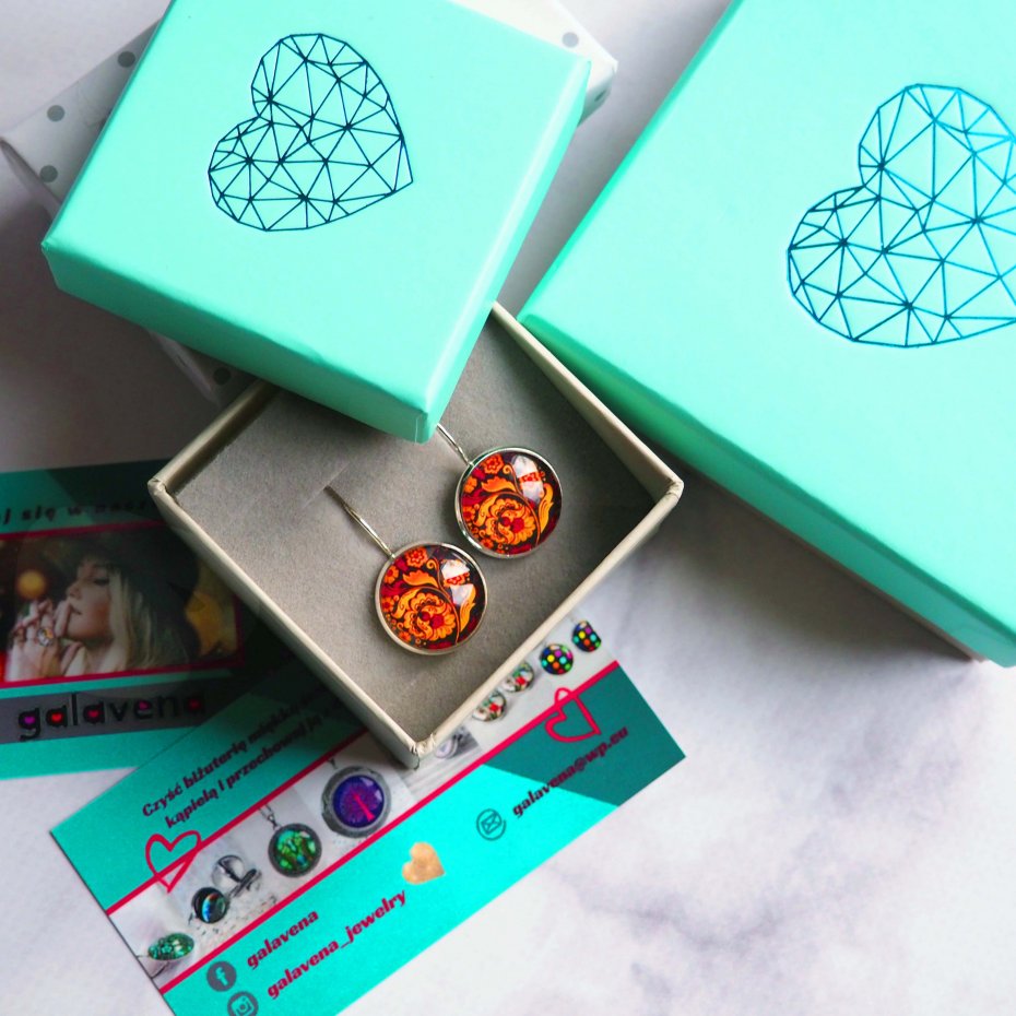 Niebanalne kolczyki wiszące z oryginalną grafiką pod wypukłym szkiełkiem w oprawie w kolorze srebra. Dodatkową ozdobę stanowią szklane kuleczki. Bigle wykonane ze srebra próby 0,925. Szkła z grafiką są unikatowe, wykonane ręcznie według mojego projektu, z dbałością o każdy detal, dzięki czemu biżuteria ta jest jedyna w swoim rodzaju i niespotykana. Kolczyki są hipoalergiczne, nie zawierają niklu i ołowiu.