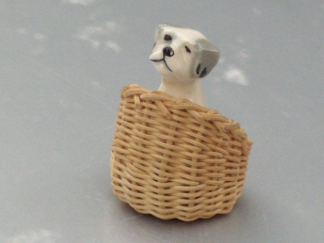 Śłodka wielce figurka Pieska w koszyczku. Raczej ceramiczna,niż porcelanowa; Pusta w środku,lekka...urocza :) Na błyszcząco szkliwiona,ręcznie ozdabiana. Małe cudeńko do zakochania :)