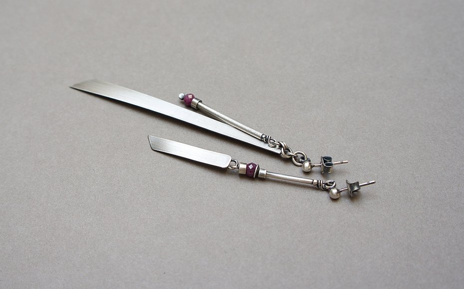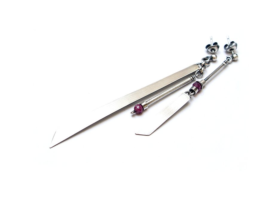 Kolczyki asymetryczne wykonane własnoręcznie od podstaw ze srebra [pr. 925] w połączeniu z fasetowanymi kuleczkami rubinów [3mm]. Wielkość blaszek [3cm i 7,5cm]. Całość oksydowana i przetarta. Całkowita długość kolczyków ok. 8,4cm i 6cm. Biżuteria ozdobnie zapakowana .