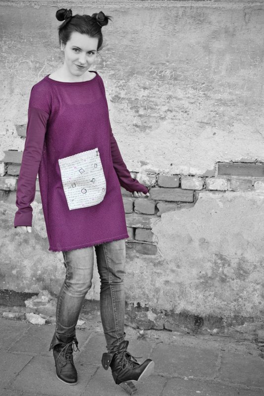 Bluza oversize wykonana została ze śliwkowego ażurowego materiału. Rękawy z gładkiej śliwkowej dzianiny. Z przodu naszyta duża, ozdobna kieszeń zapinana na zamek. Prosty krój, bardzo wygodna. Rozmiar M