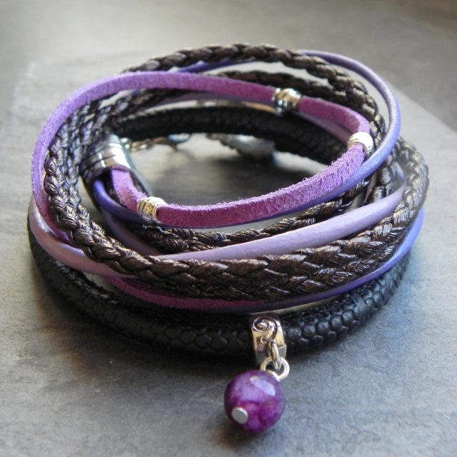 Efektowna bransoletka wykonana tylko w JEDNYM EGZEMPLARZU, z różnorodnych rzemieni ze skóry ekologicznej, fasetowanego agatu (6 mm) oraz elementów w kolorze srebrnym. Bransoletka będzie pasowała na nadgarstek 15 -16 cm, podwójnie oplatana.