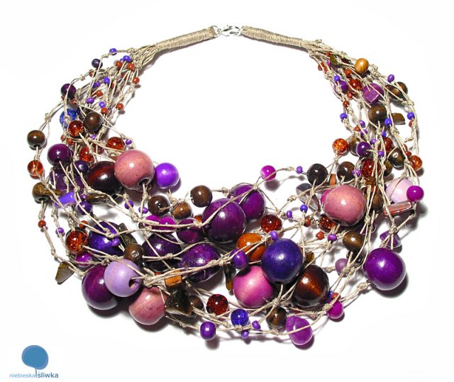 Autorski naszyjnik wykonany na przędzy lnianej z korali w tonacji śliwkowych fioletów i brązów. W naszyjniku znalazły się korale szklane, drewniane, crackle, nieregularne bryłki jaspisu, marmur, tygrysie oko. Długość naszyjnika ok. 46 cm, zapięcie posrebrzane.