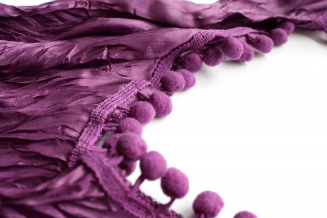 Niezwykły, gnieciony szal w głębokim odcieniu fioletu. Uwagę zwraca również ciekawe wykończenie brzegów.