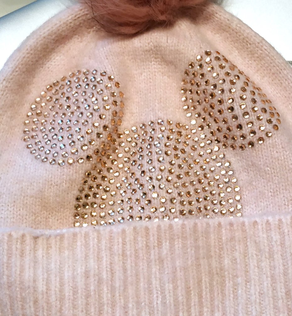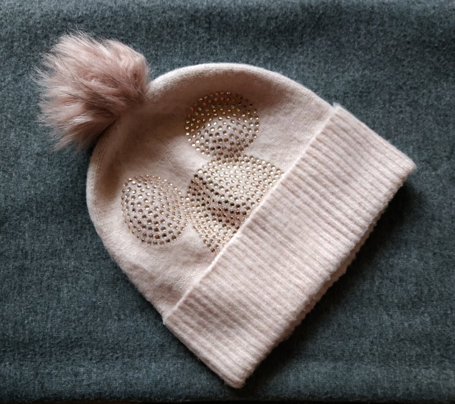 kolor zgaszony jasny róż,ozdobiona malutkimi różowymi sztrasami oraz futrzanym pomponem.