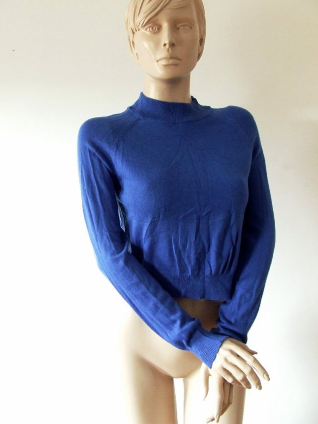 Miękki, przyjemny w dotyku sweterek w stylu retro, w ładnym kobaltowym kolorze. Wkładany przez głowę, z tyłu zapinany na zip.