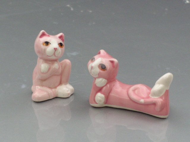 Wyjątkowy koci duet - ona i on w słodkich odsłonach, zwłaszcza jego poza urzeka kocim wyluzowaniem :) Ręcznie malowane, na błyszcząco szkliwione, puste w środku. On, jak być powinno, z gorszą twarzą, bo z wadami szkliwienia, jakby bledszy, bardziej zmatowiony. Ona zaś w pełni urody :) On - 9 x 4 x 6; Ona - 5 x 4,5 x 7 cm. Stan zachowania dobry i bardzo dobry.