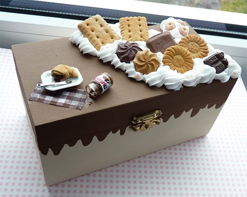 Urocze drewniane pudełko, zdobione miniaturowymi słodkościami z masy termoutwardzalnej FIMO:) wymiary: 18cm x 9cm x 7cm