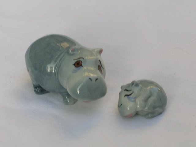 Mama z maleństwem. Hipopotamowa lita porcelana, ręcznie malowana i na błyszcząco szkliwiona. To spojrzenie ! 5,5 x 3,5 x 3 i 3 x 2 x 1,5 cm. Stan zachowania bardzo dobry.
