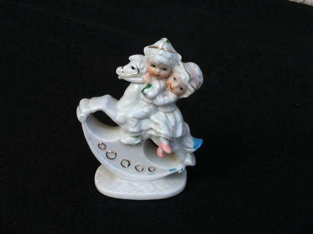 Niezaprzeczalnej aniołkowej słodkości lekka figurka porcelanowa, dawną metodą stemplowana A. Fakturowość dziecięcych draperii, symboliczne spotkanie różu z błękitem, złocenia i ten konik na biegunach, co w radosne przestworza dziecięcej fantazji je unosi :) 8 x 5 x 10 cm. Stan zachowania bardzo dobry.