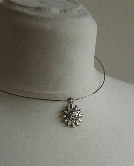 Naszyjnik w kolorze srebrnym - zrobiony z kolistej, sztywnej obręczy i słonecznego wisiorka.