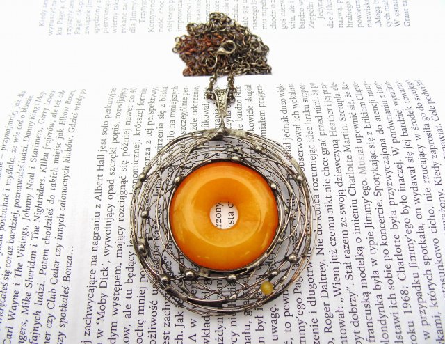Wisiorek wykonany z miedzi, cyny, jadeitu i nefrytu. Średnica ok. 6,7 cm. Wisi na miedziano - posrebrzanym łańcuszku o długości ok. 80 cm.