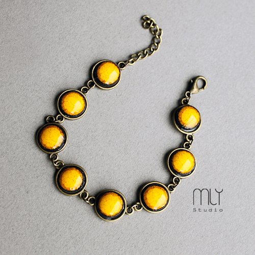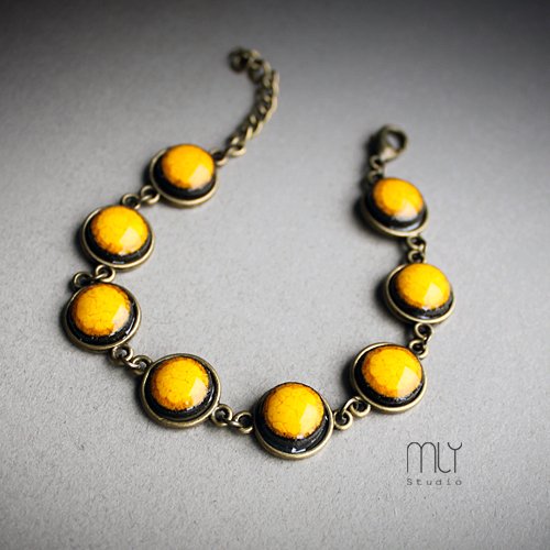 Efektowna bransoletka wykonana z ceramicznych elementów, szkliwionych zółtym szkliwem, elementów metalowych w kolorze starego złota Obwód regulowany, średnica elementu ceramicznego około 10mm . Polecam . Termin realizacji zamówienia to 1-2 dni.