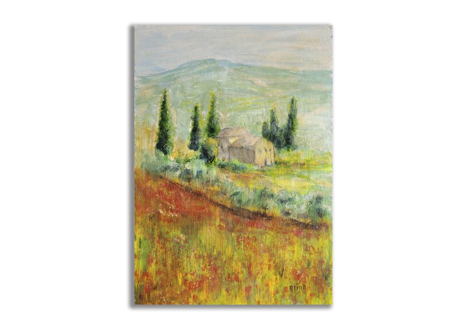 Malowidło emanuje ciepłem południowego słońca i spokojem wiejskiego życia. Charakterystyczne smukłe cyprysy otaczają tradycyjny kamienny dom, tworząc kompozycję pełną harmonii.