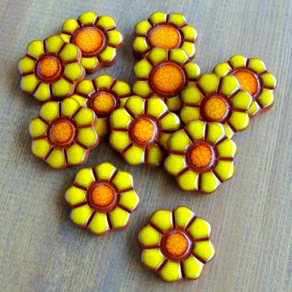 Zestaw 12 ceramicznych kwiatów na magnes. Wykonane z brązowej gliny, pokryte błyszczącymi szkliwami efektowymi w soczystych kolorach. Wymiar kwiatka - ok. 3 cm. Polecam.